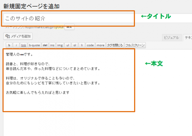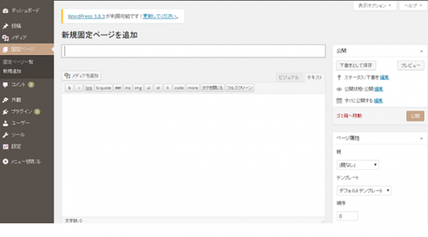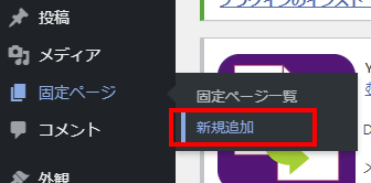 ①管理画面の「固定ページ」メニューから「新規追加」をクリック。
